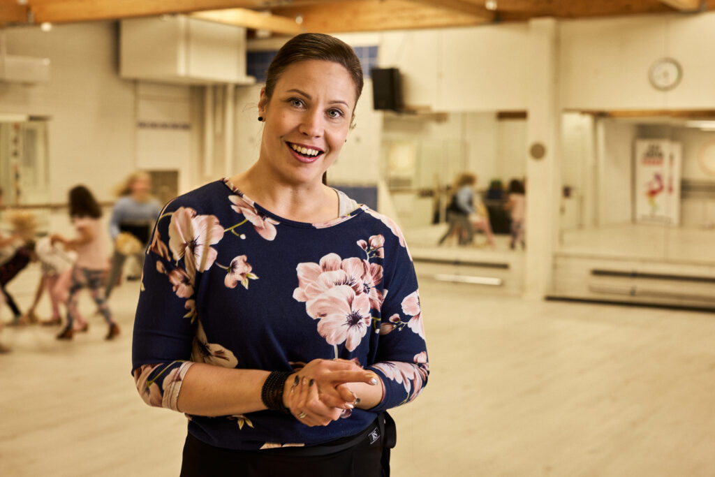 Muuralankuja nelosen toisessa kerroksessa tarkenee t-paidassa. Isossa salissa askelkuvioita harjoittelevat Tanssiklubi Kotkan Hyrrien aikuisten sekä lasten kilpatanssiryhmät. Hyrrät ovat olleet jo vuosia vuokralaisina Karhulassa sijaitsevassa liikekiinteistössä.