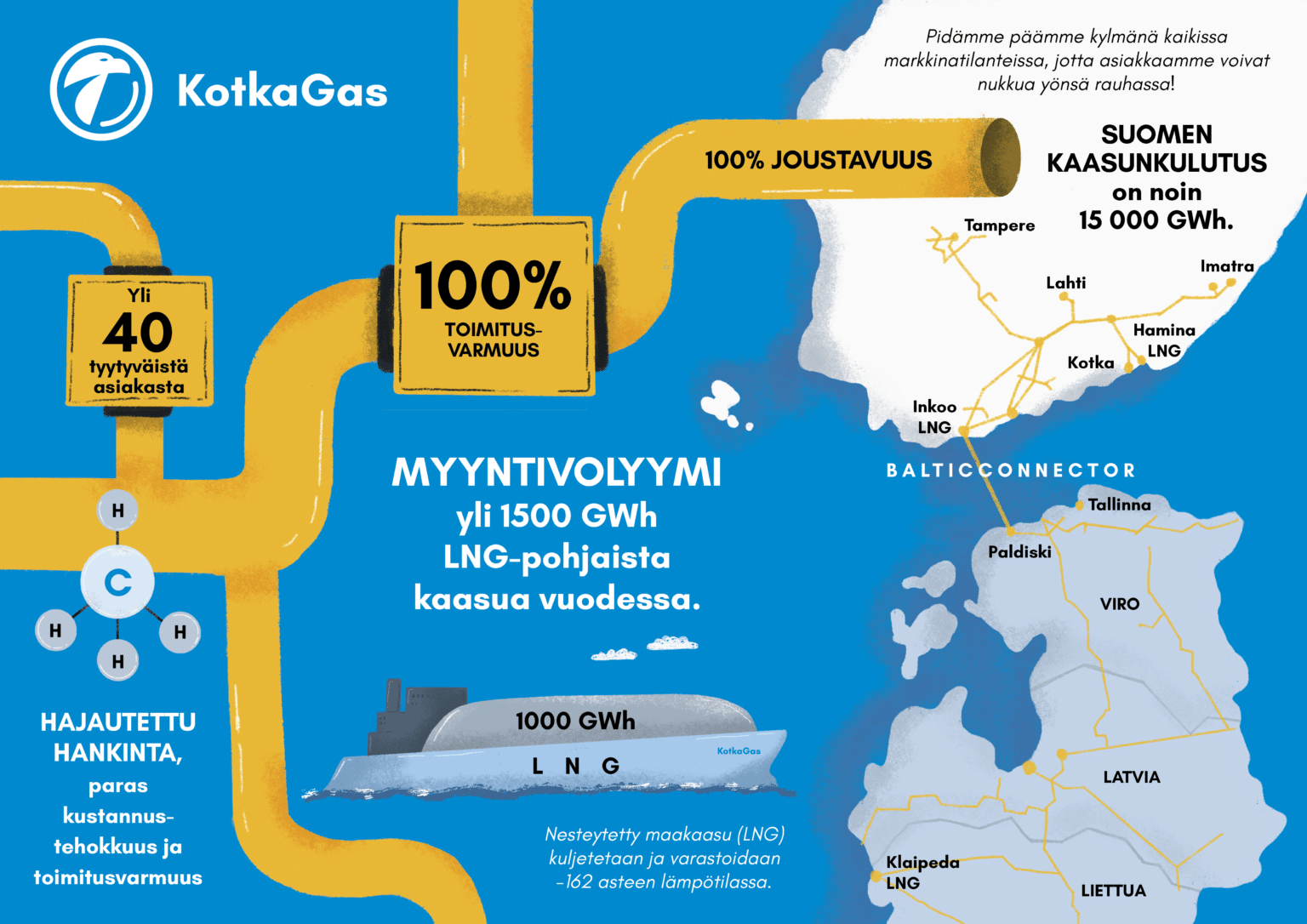 Palvelemme erityisesti teollisia toimijoita niin Kotkassa kuin muuallakin Suomessa. Emoyhtiömme Kotkan Energia Oy käyttää maakaasua omassa lämmön- ja energiantuotannossaan Kotkan alueella.