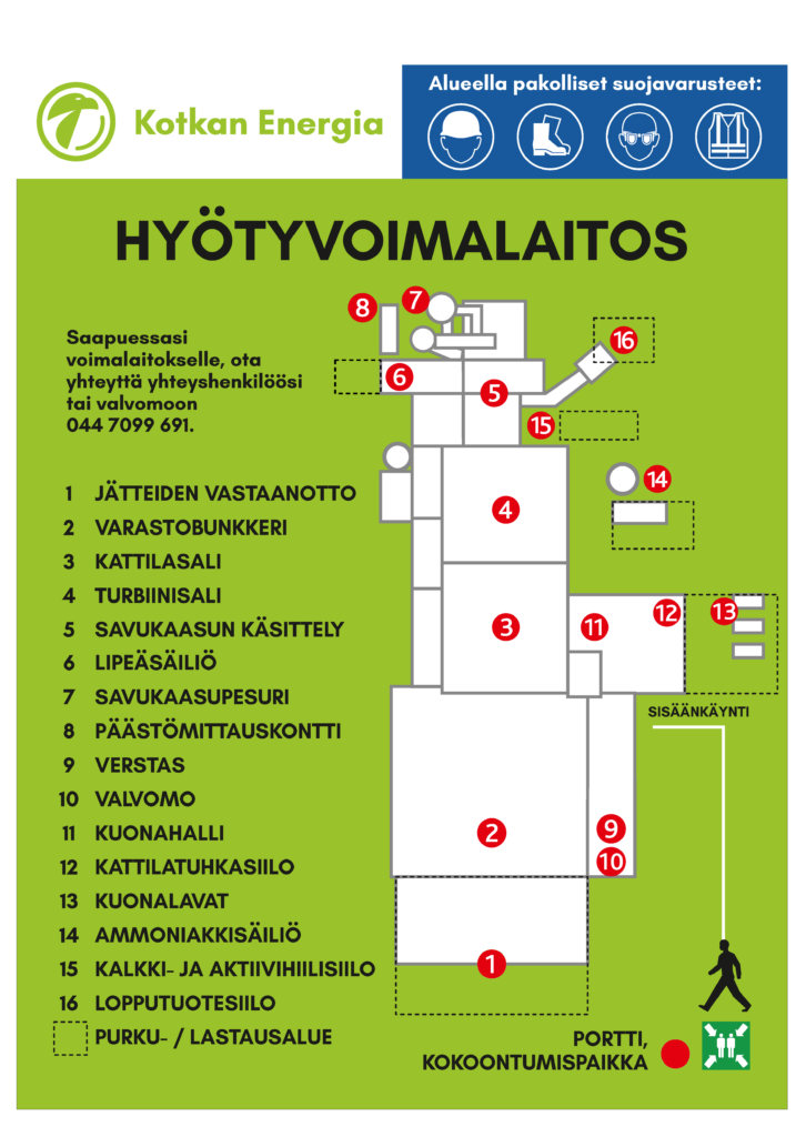 Työmaa-alueella saa liikkua vain kulkuluvan saaneet henkilöt ja ajoneuvot. Henkilöliikenne alueelle tapahtuu vain voimalaitoksen henkilöportin kautta. Ajoneuvot voimalaitosalueella ovat sallittuja, kun tavaroiden yms. kuljettamisesta on sovittu erikseen voimalaitoksen työnjohdon kanssa. Mikäli ajoneuvo saa luvan liikkua voimalaitosalueella, voi ajoneuvon mukana tulla alueelle vain kuljettaja. Muut henkilöt kulkevat henkilöportin kautta. Hälytyksen sattuessa, siirry välittömästi kokoontumispaikalle, eli pääportille odottamaan lisäohjeita.
