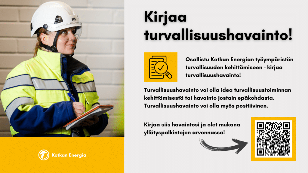 Tapaturmasta tai läheltä piti -tilanteesta on velvollisuus ilmoittaa heti Kotkan Energian edustajalle.