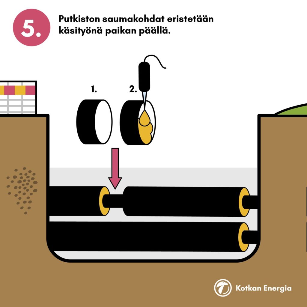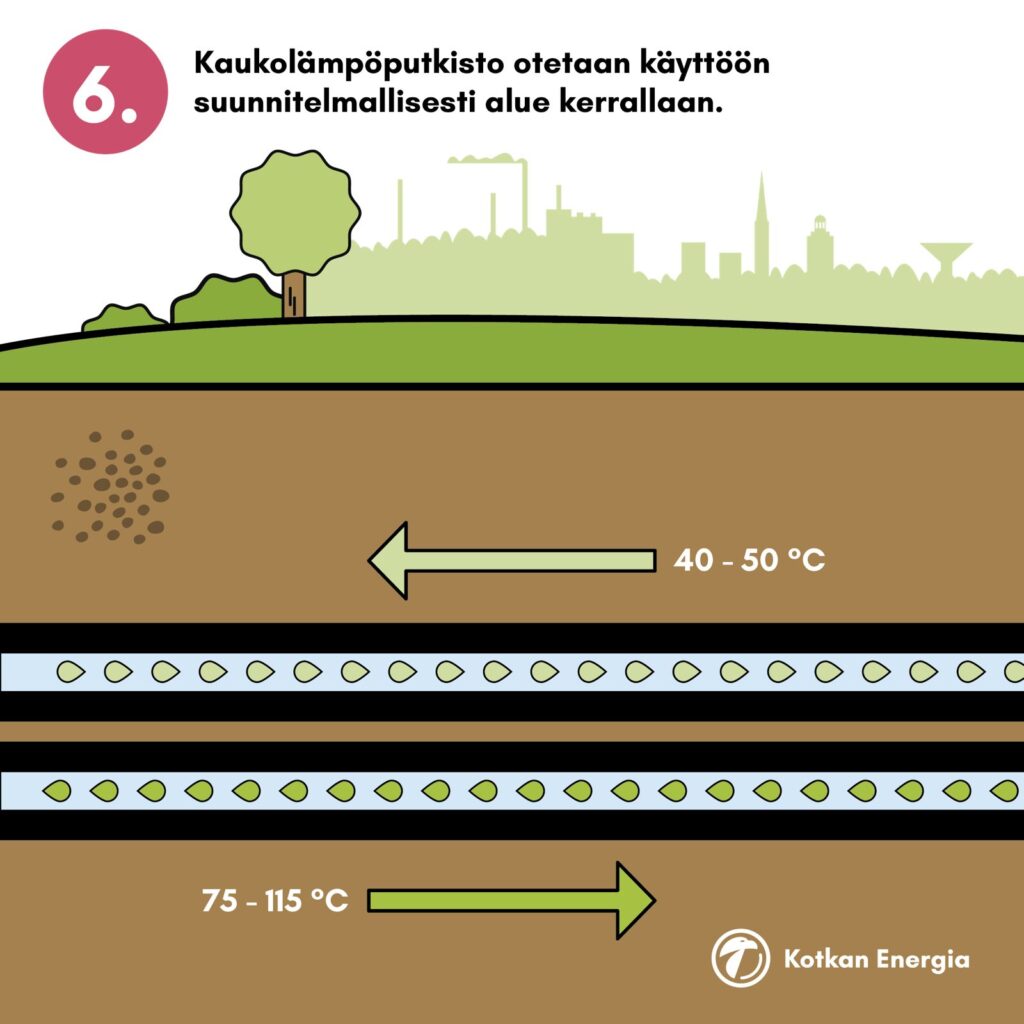 Kotkan Energia rakentaa liittymäjohdon ja toimittaa mittauskeskuksen kiinteistön tekniseen tilaan. Lämmönjakokeskuksen hankinta ja asentaminen kuuluvat asiakkaan vastuulle, ellei sovita avaimet käteen -ratkaisusta.