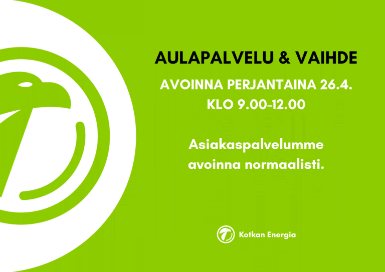 Aulapalvelumme sekä puhelinvaihteemme sulkeutuu poikkeuksellisesti klo 12.00 perjantaina 26.4.2024. Asiakaspalvelumme on avoinna normaalisti.