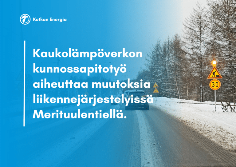 Kaukolämpöverkon kunnossapitotyö aiheuttaa muutoksia liikennejärjestelyissä Merituulentiellä. Työmaaosuudella on käytössä erilliset liikennevalot sekä Mussalon että Kotkansaaren